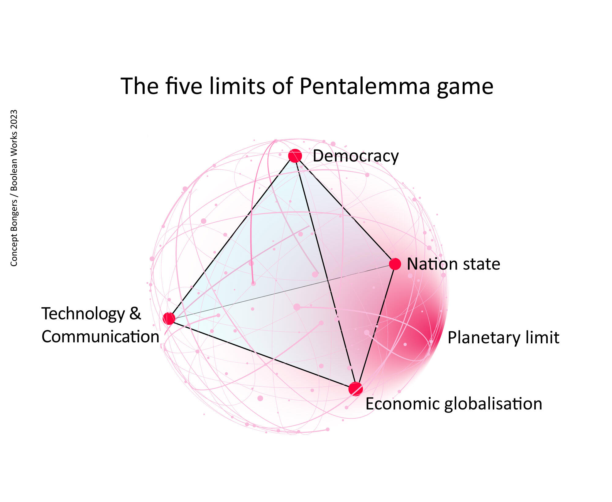 To finalise the interplay with Rodrik's trilemma into a coherent Pentalemma concept, we have recently connected the five limits and made them conceptually and materially congruent. In this model, four limits are inherently interconnected in a tetrahedron, a four-pointed pyramid, where each node is connected to the other three. This structure fits perfectly within Earth's globe, illustrating the planetary limits as manifested in today's Earth's crises. This diagram forms the foundation of the Pentalemma game.