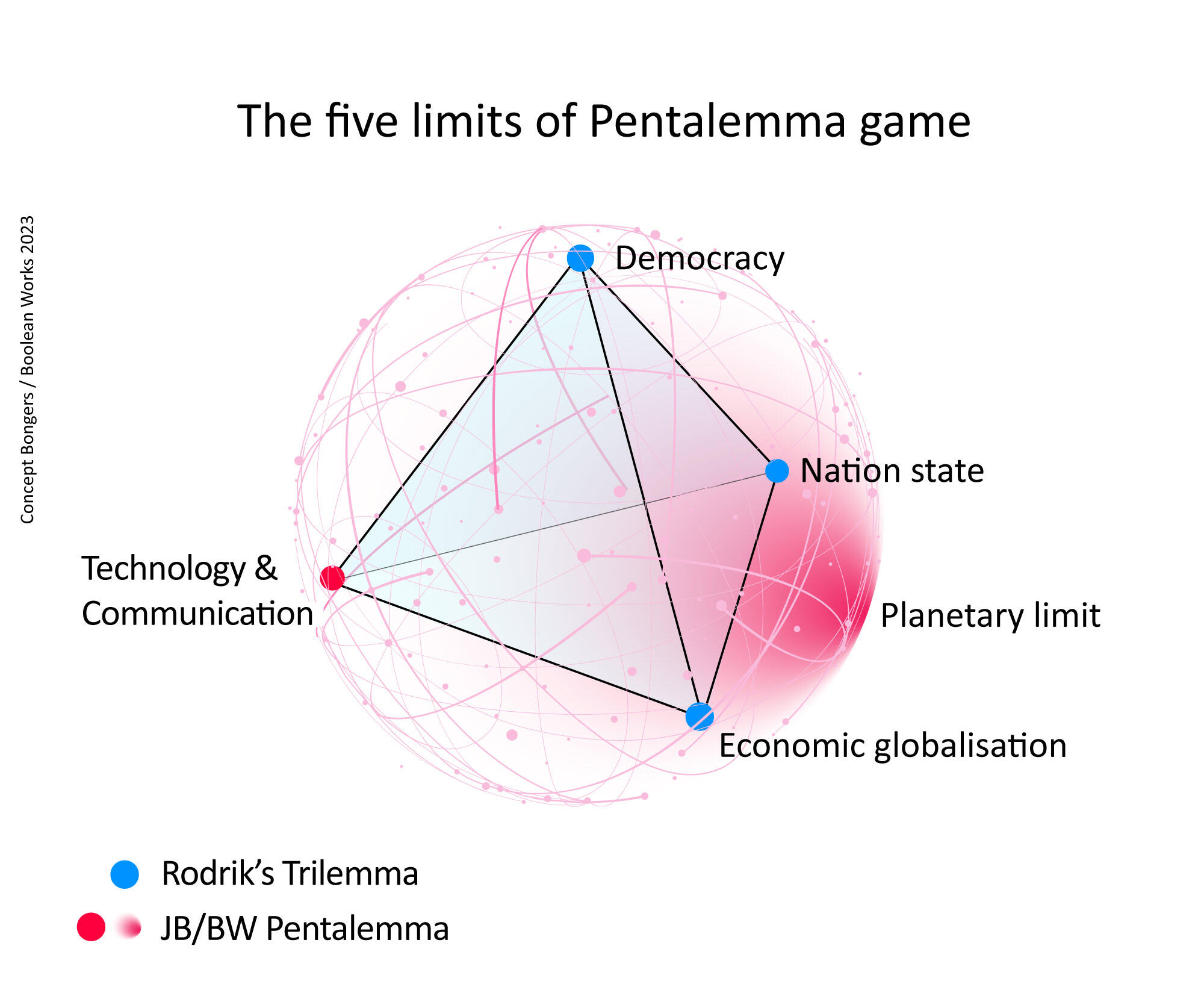 In 2011, building on the knowledge acquired from numerous applications of STIP | PITS | TIPS, we began to delve deeper into the various limits of Rodrik's Trilemma and clustered all details and relations.The most significant modification to Rodrik's Trilemma since 2017 is illustrated in the Penta of the Pentalemma. Over the years, our awareness of Earth's systemic crises grew, climate change and the degradation of ecological systems, all constrained by the 'Planetary limit'. The unchecked negative impact of technology, communication and media in personal, public and political realms now interferes with the growing concern over the future of life on earth.The technical and rational mindset inherent in capitalism fuelled the exploitation of not only Earth's resources but also 'social energy' in democratic processes, or today, through AI, it extends to the realm of ideas, creative outputs and it operates in the realm between real and fake. This realisation highlights key elements missing in Dani Rodrik's original Trilemma model, making it more academic and less connected to real-world challenges. Rodrik's model, despite being termed a 'Political Trilemma', essentially operates as a tool within the capitalist framework. It evaluates how to optimise economic outcomes while minimising costs to the environment and democratic ideals. This rational approach has permeated political thinking and has played a role in the emergence of populism.
